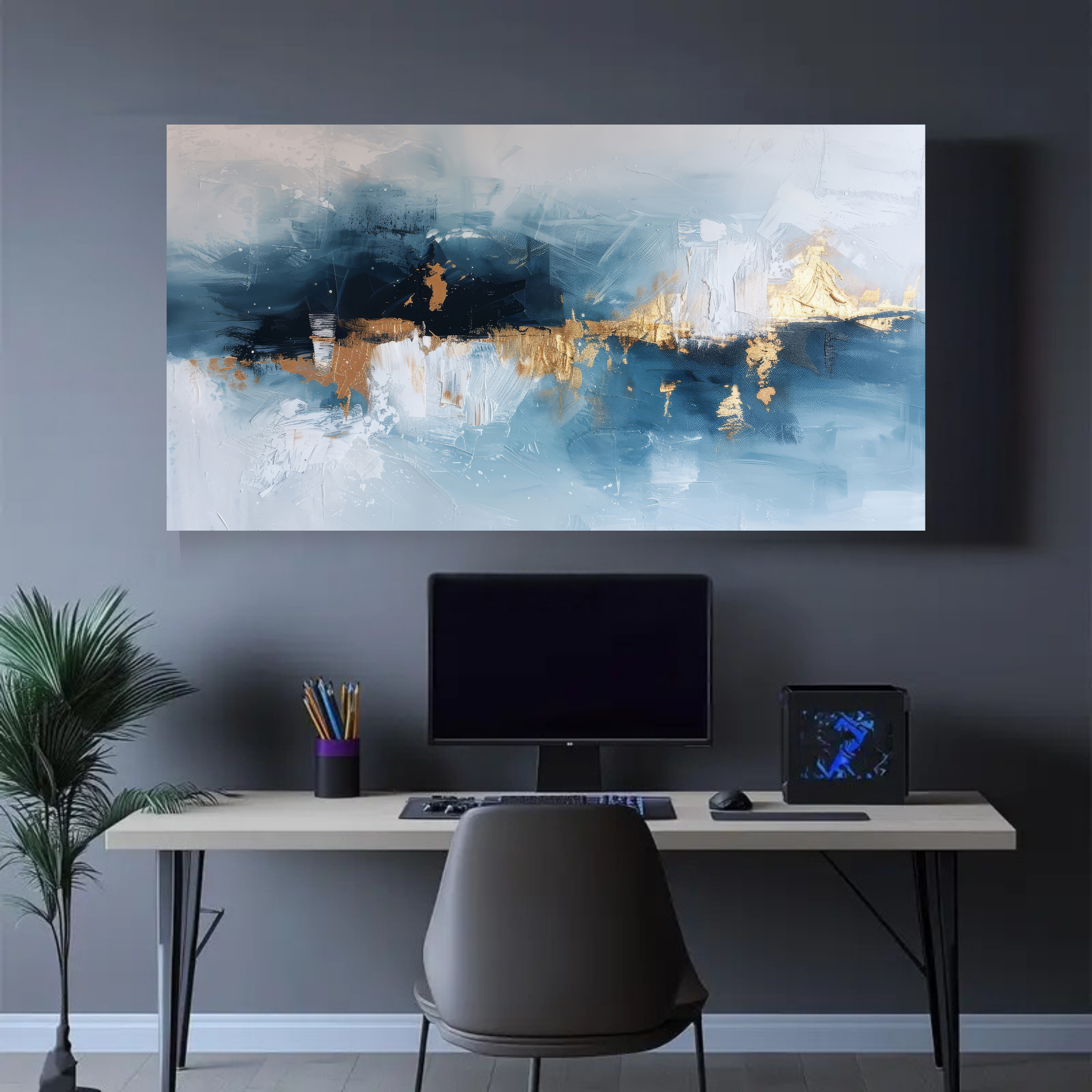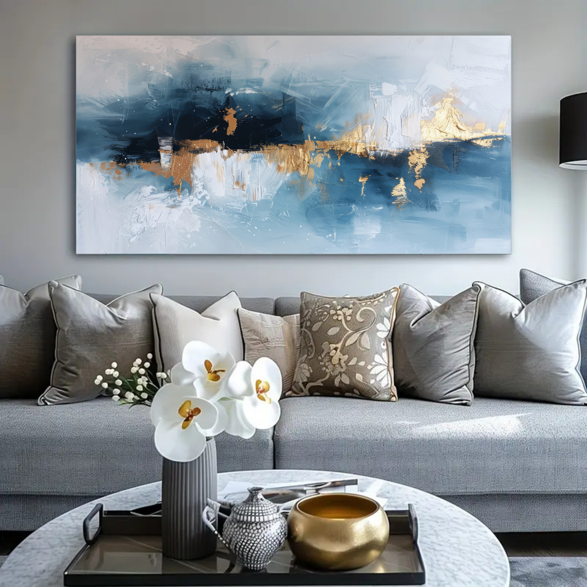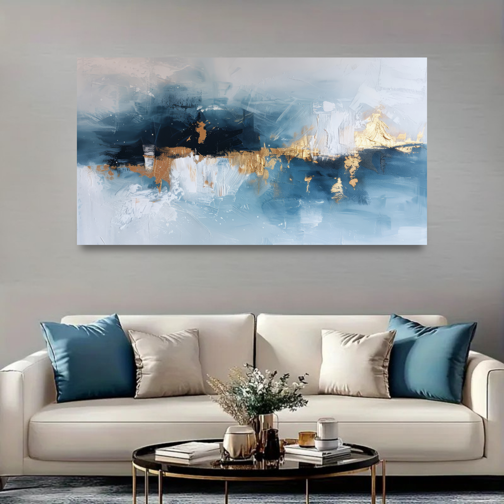 Inspirée par la force et la douceur de la mer, cette toile abstraite marie subtilement le bleu, le blanc et l’or pour créer une atmosphère paisible et moderne.