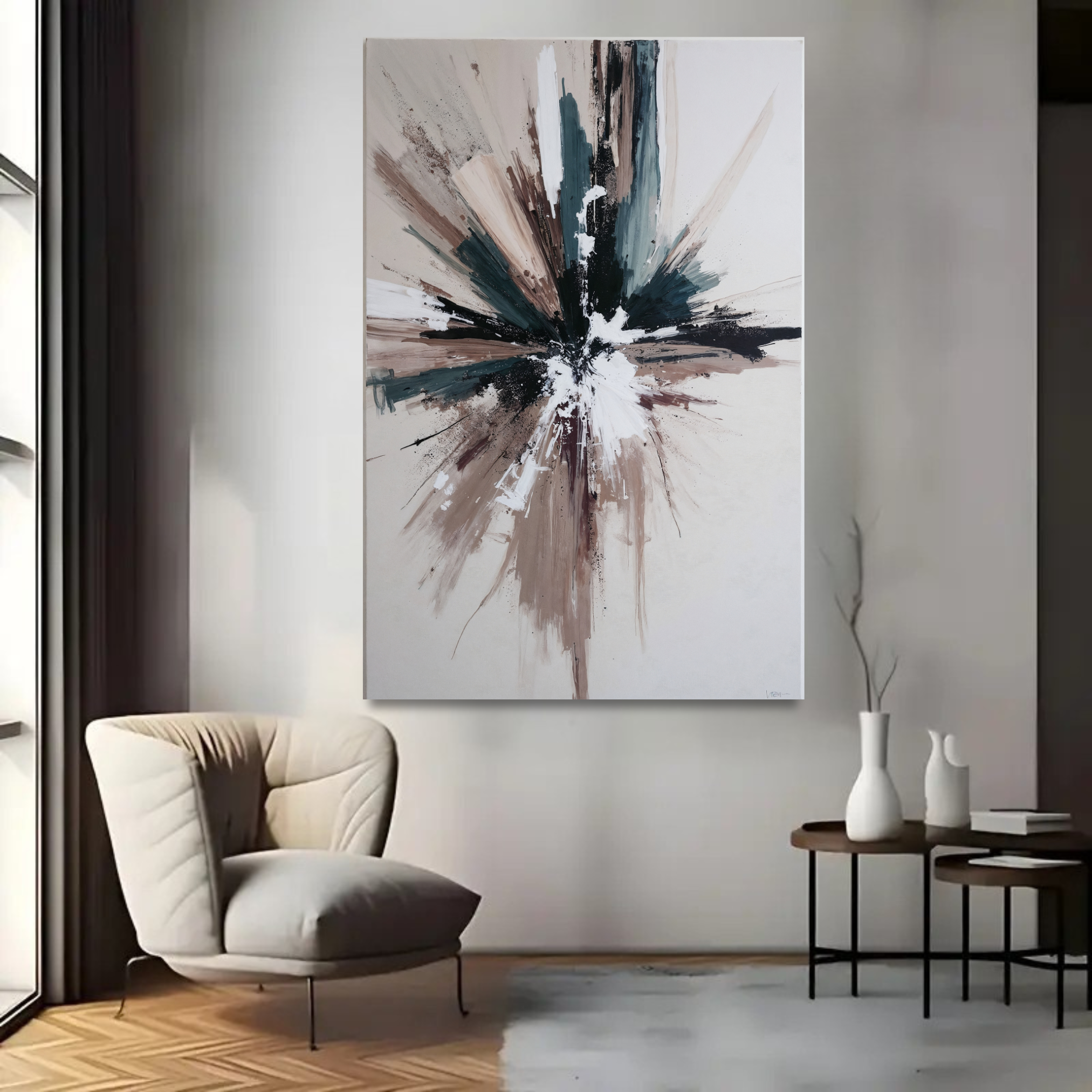 Ajoutez de la profondeur avec des teintes riches. L’utilisation du vert-de-gris, du marron terreux et du noir confère une palette mature et raffinée. Ce tableau est parfait pour créer une ambiance feutrée et chic, s’harmonisant parfaitement avec les intérieurs boisés ou minimalistes.