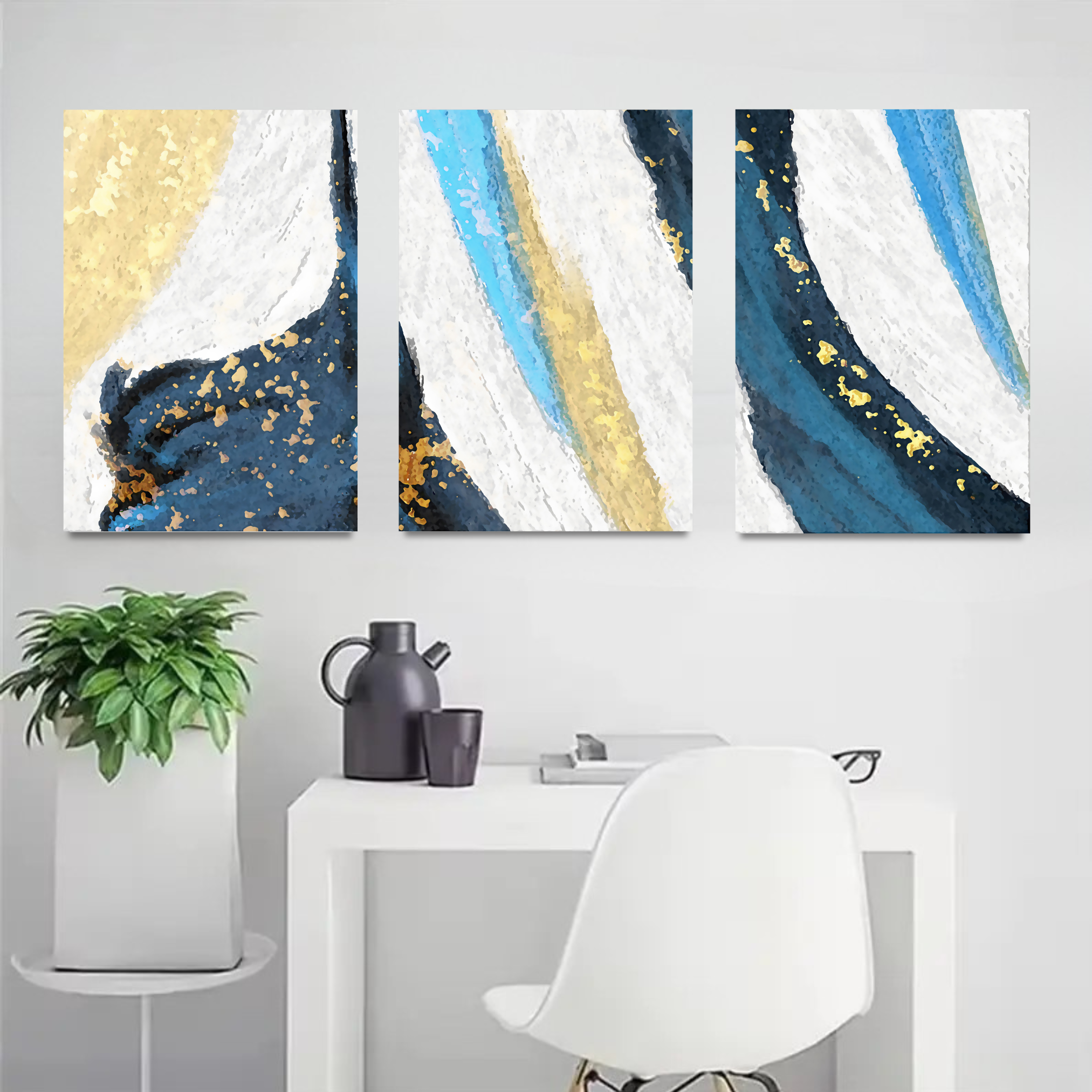 Rendez votre décor plus tactile et riche. L’épaisse application de peinture (Impasto) et les points dorés créent un relief qui change selon la lumière. Ce triptyque est un délice visuel et sensoriel, ajoutant une dimension de profondeur et de matière.