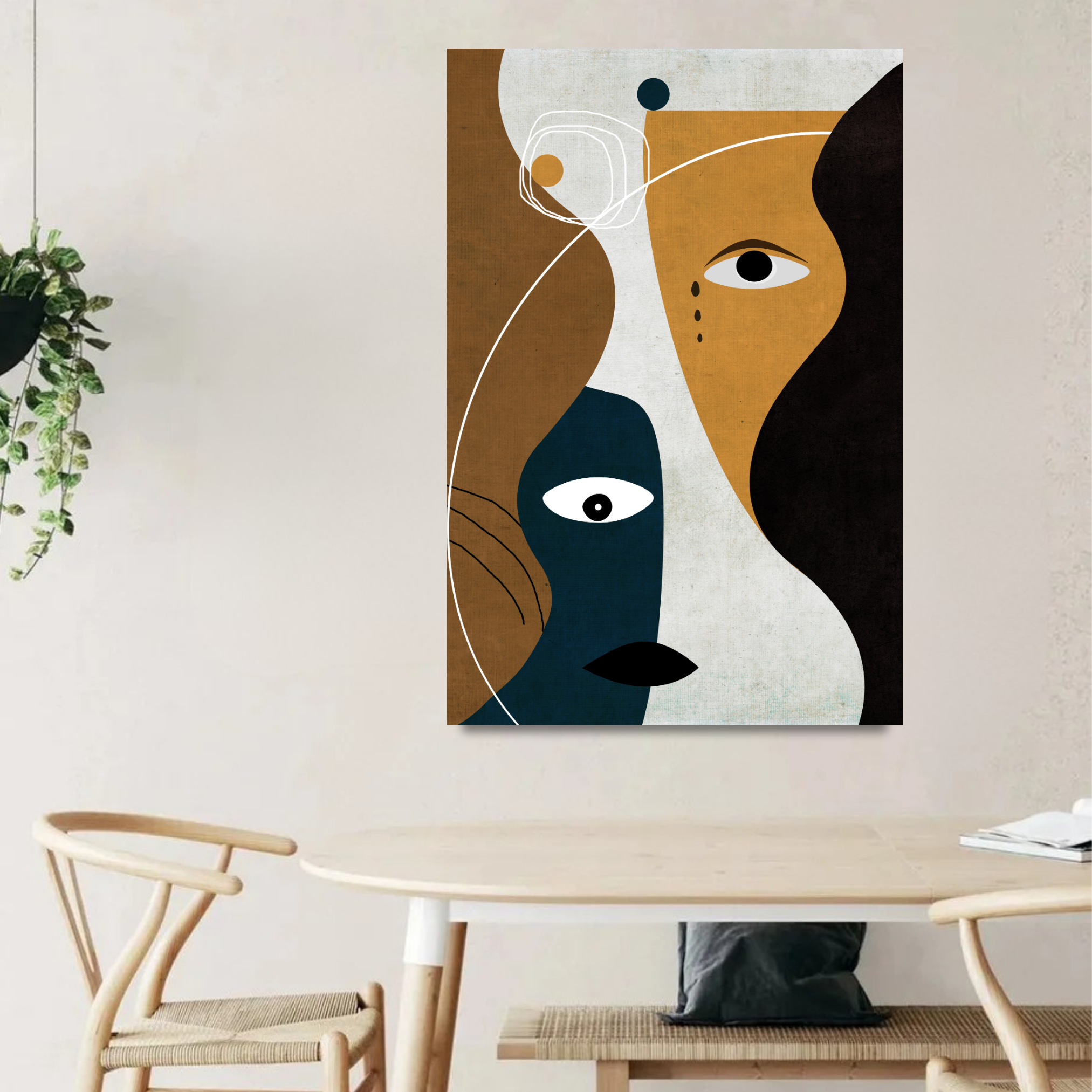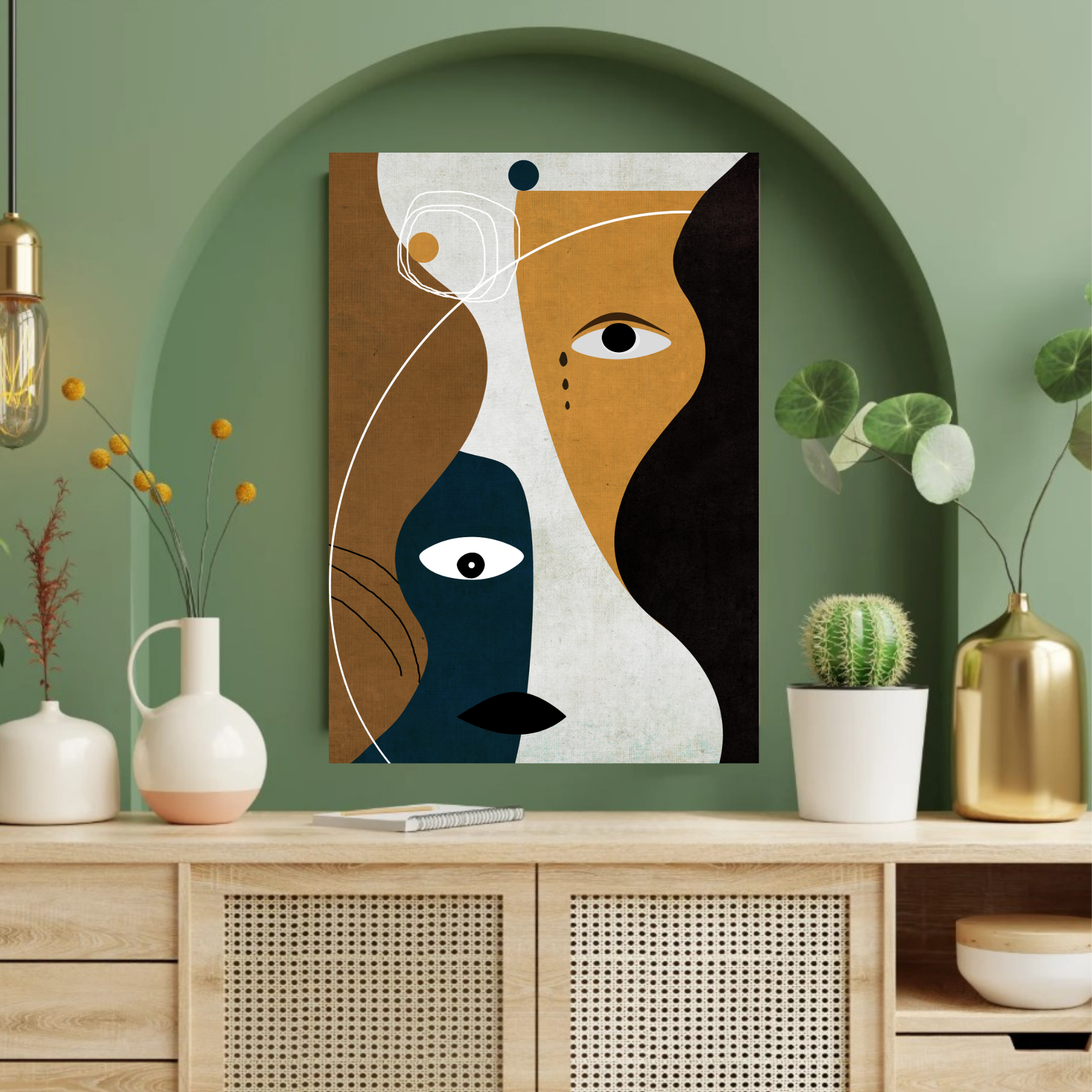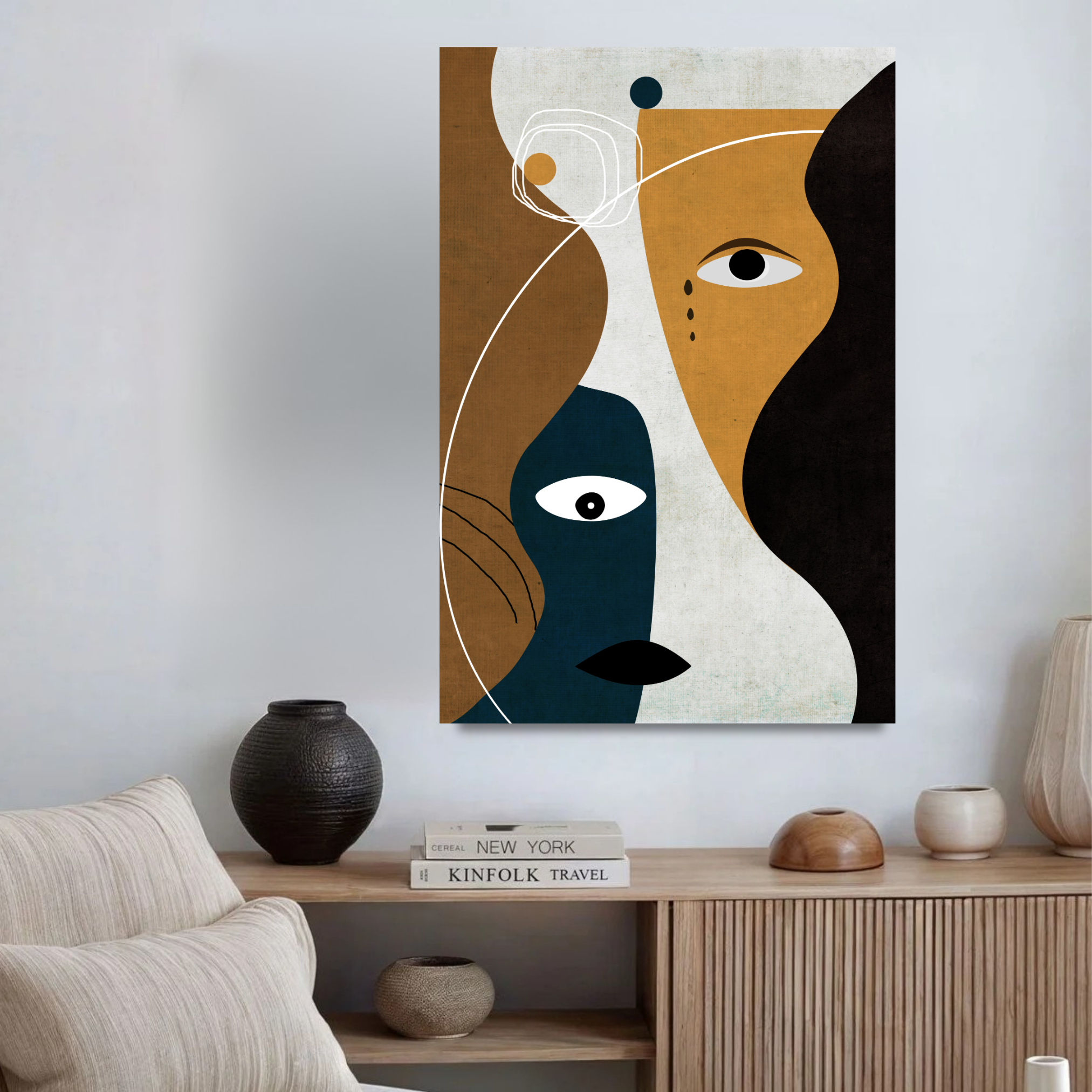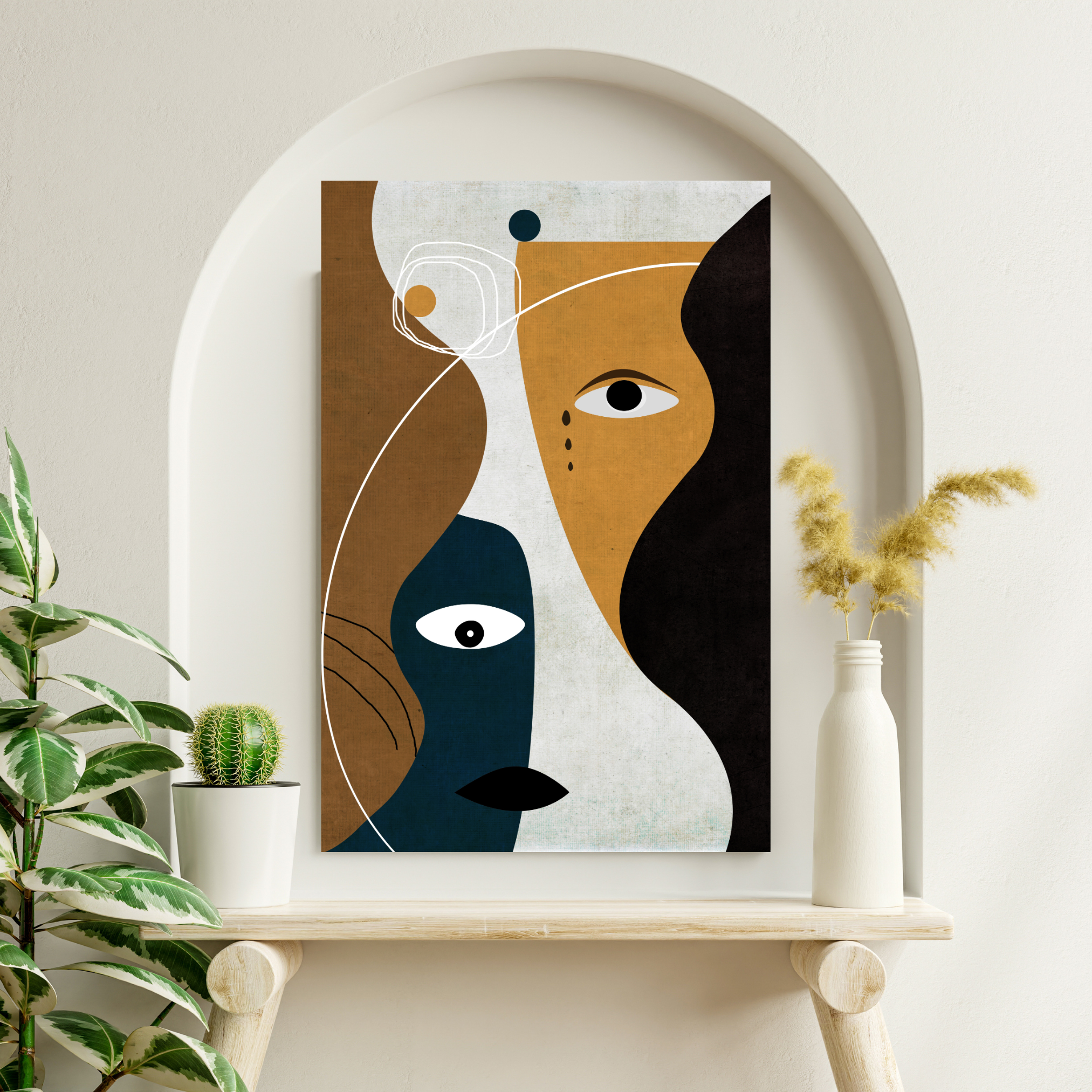 Décorez avec une harmonie graphique forte. La composition joue sur les formes imbriquées et le contraste des couleurs pour un équilibre parfait. Il est parfait pour ceux qui recherchent une pièce à la fois géométrique et organique, apportant structure et fluidité.