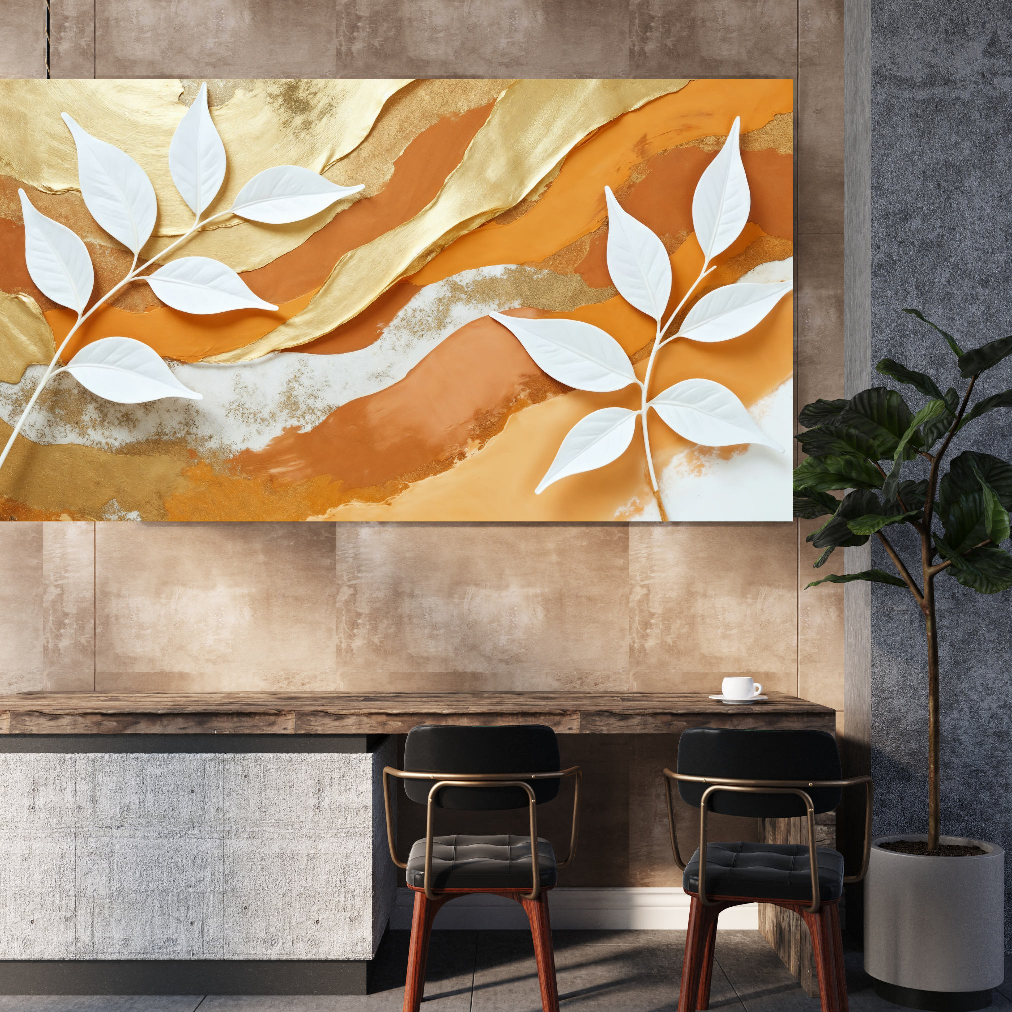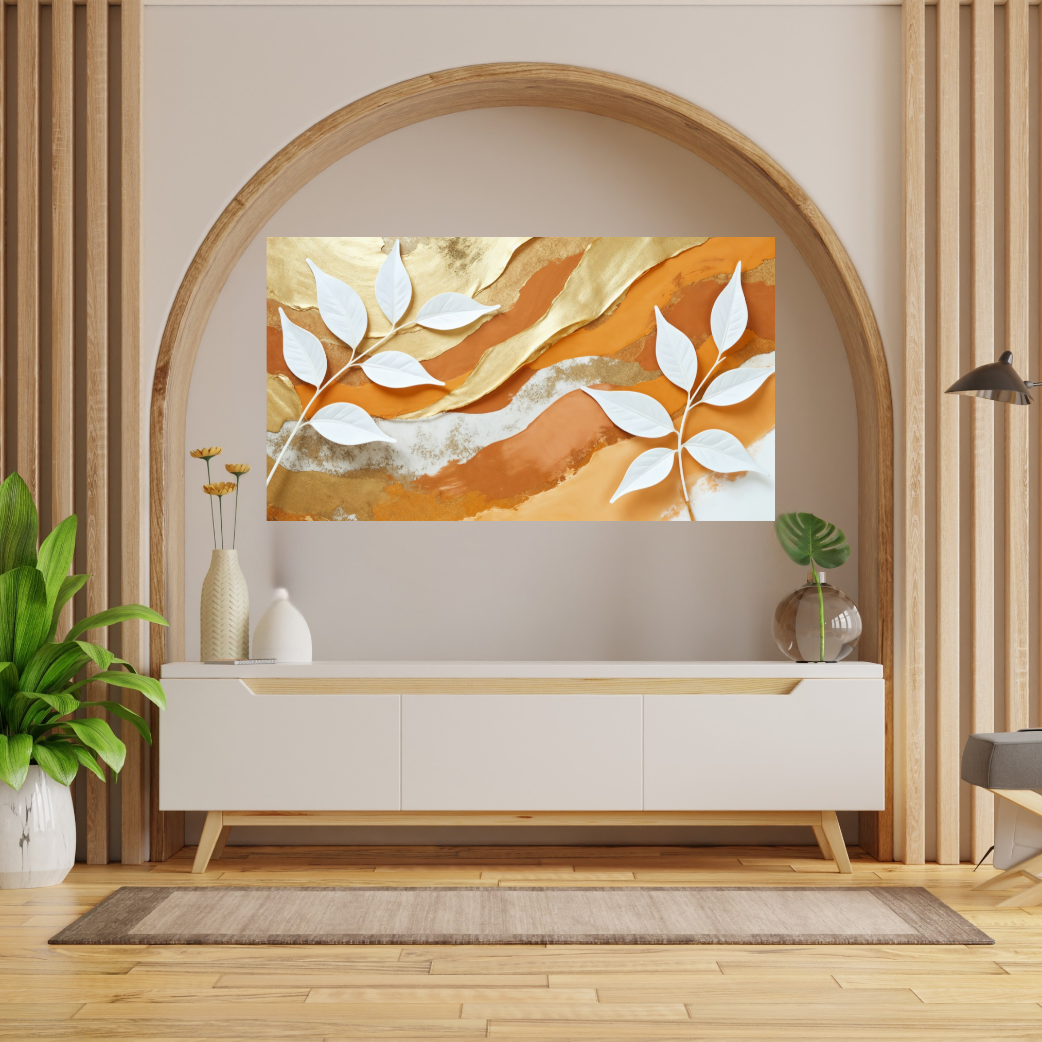 Apportez la sérénité naturelle. Ce tableau évoque une récolte dorée, combinant la douceur des teintes de terre cuite à l’éclat de l’or. Il introduit une atmosphère de calme sophistiqué et d’abondance discrète dans votre espace de vie ou de travail.