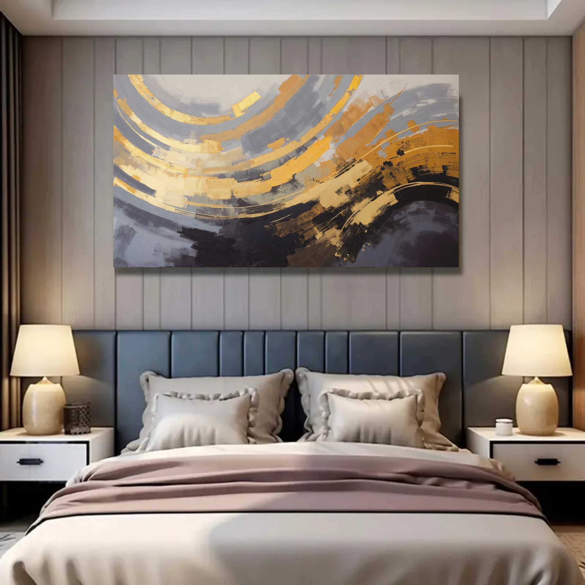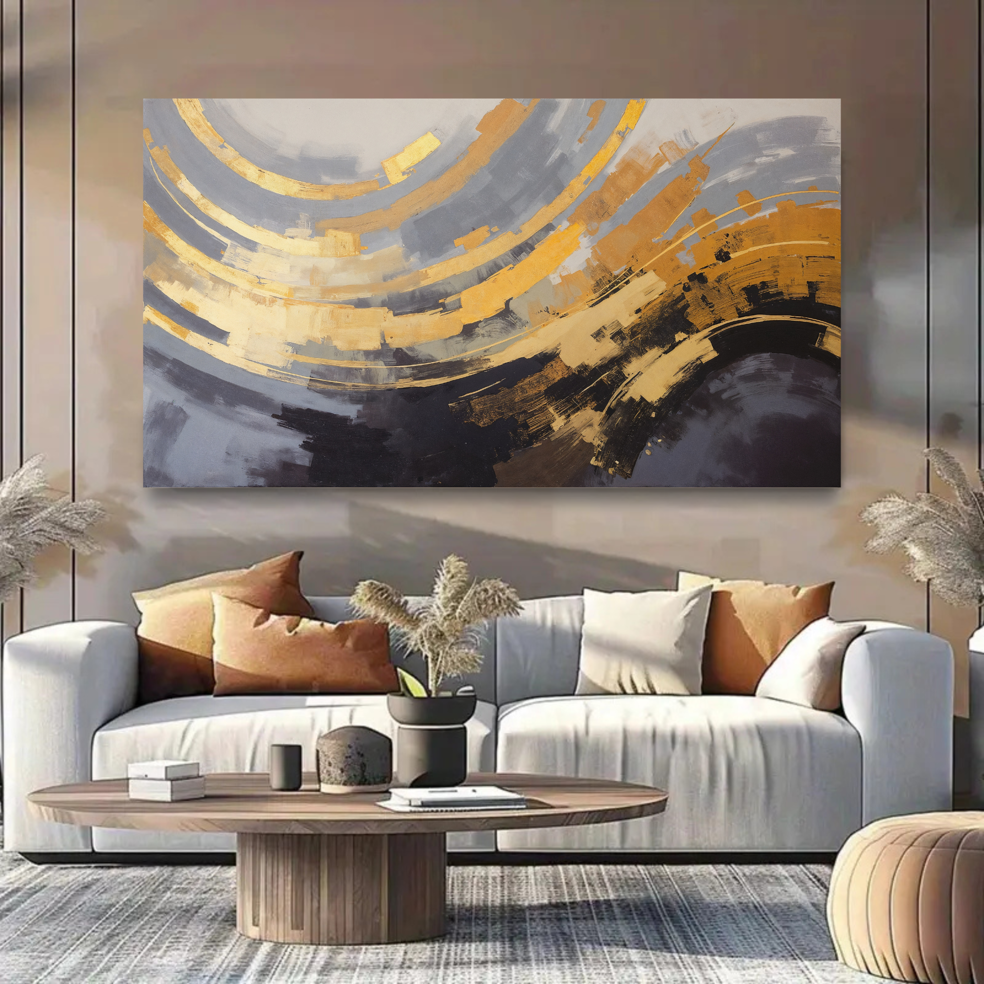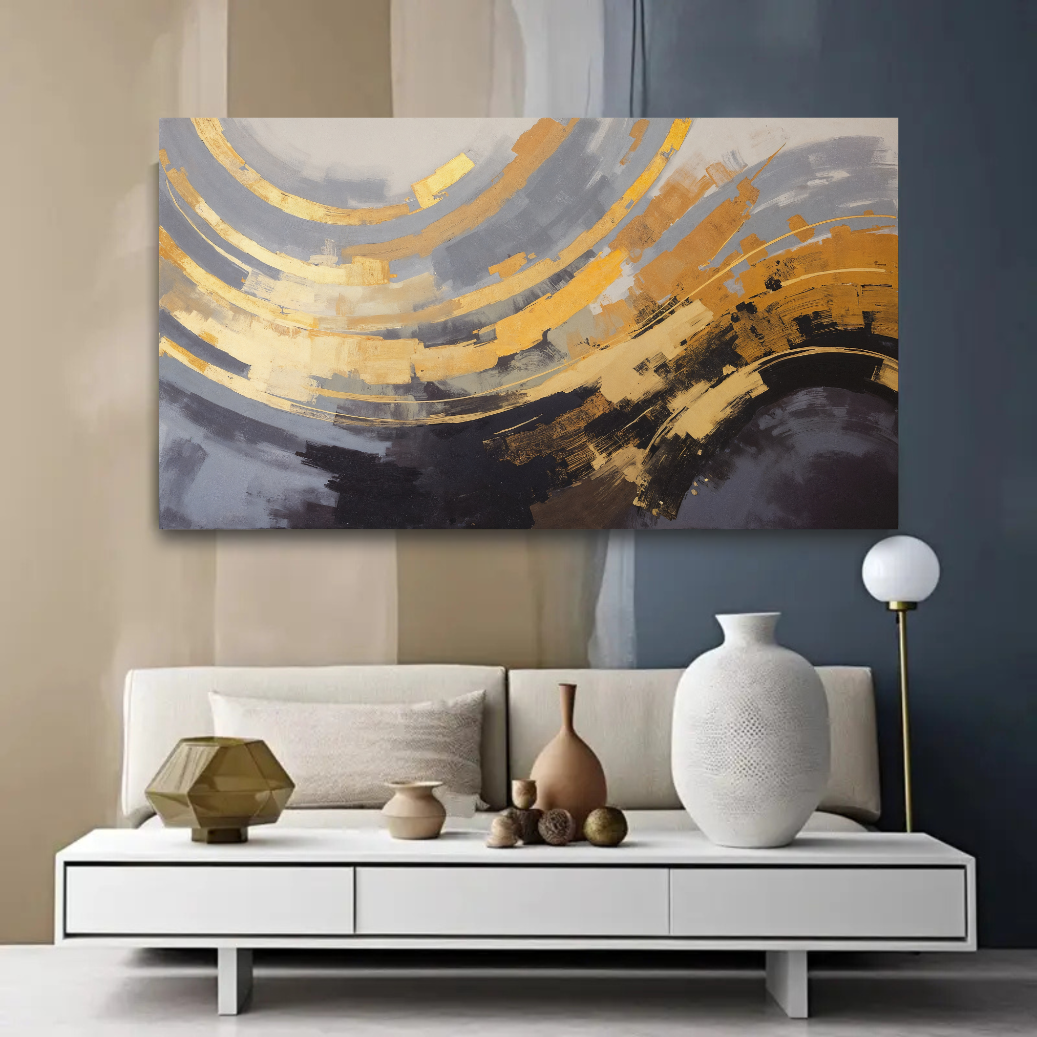Un tourbillon d’énergie et d’élégance. Les coups de pinceau vifs et texturés créent une spirale hypnotique, illuminant la toile par de riches touches de couleur or métallisé.