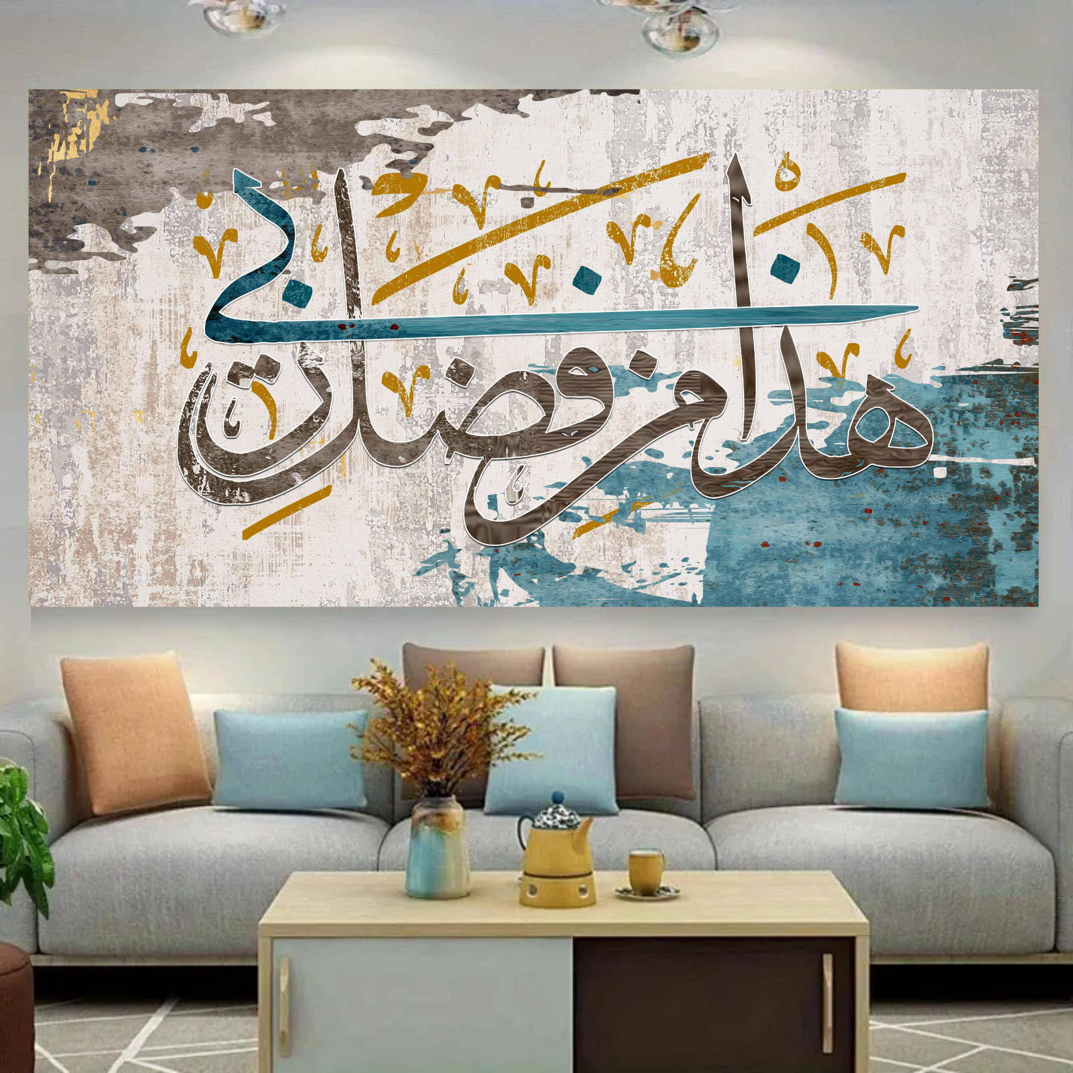 Calligraphie Abstract Une œuvre qui incarne la gratitude et la bénédiction. La puissante phrase est écrite dans un style contemporain, où les bleus profonds et l’or symbolisent la générosité et la lumière.