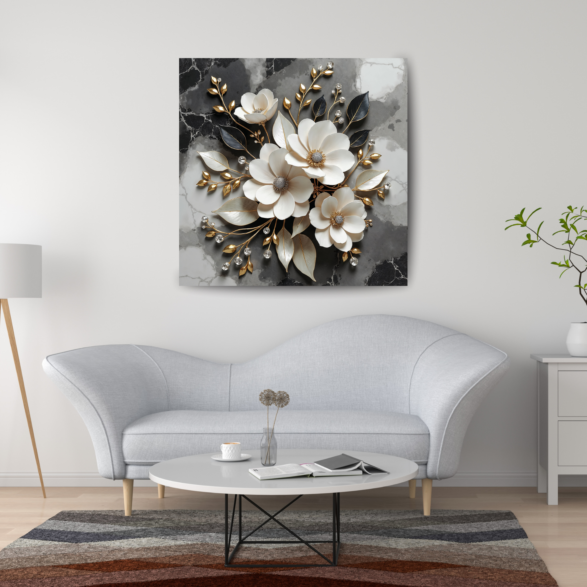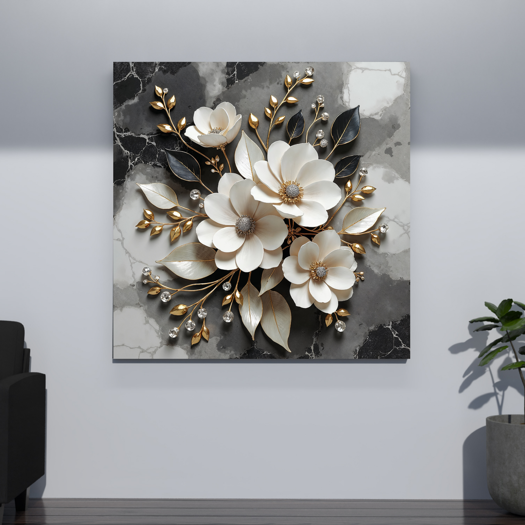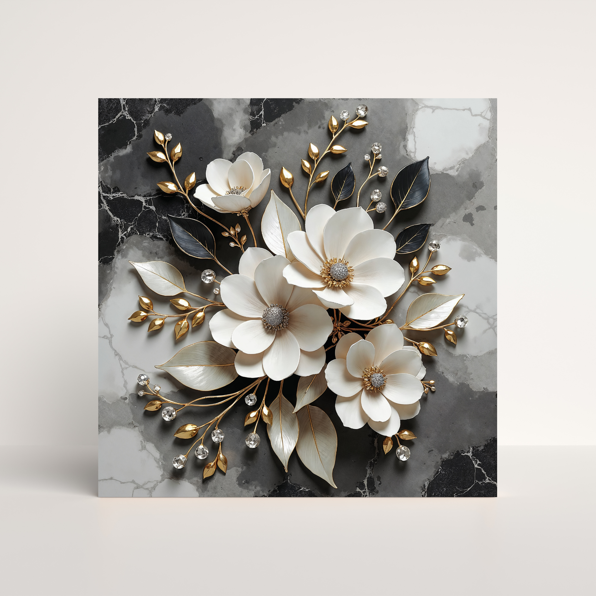 Des fleurs blanches s’épanouissent sur un marbre d’ombre et de lumière, bordées d’or et de délicates perles de clarté. Une œuvre où la pureté rencontre le luxe.