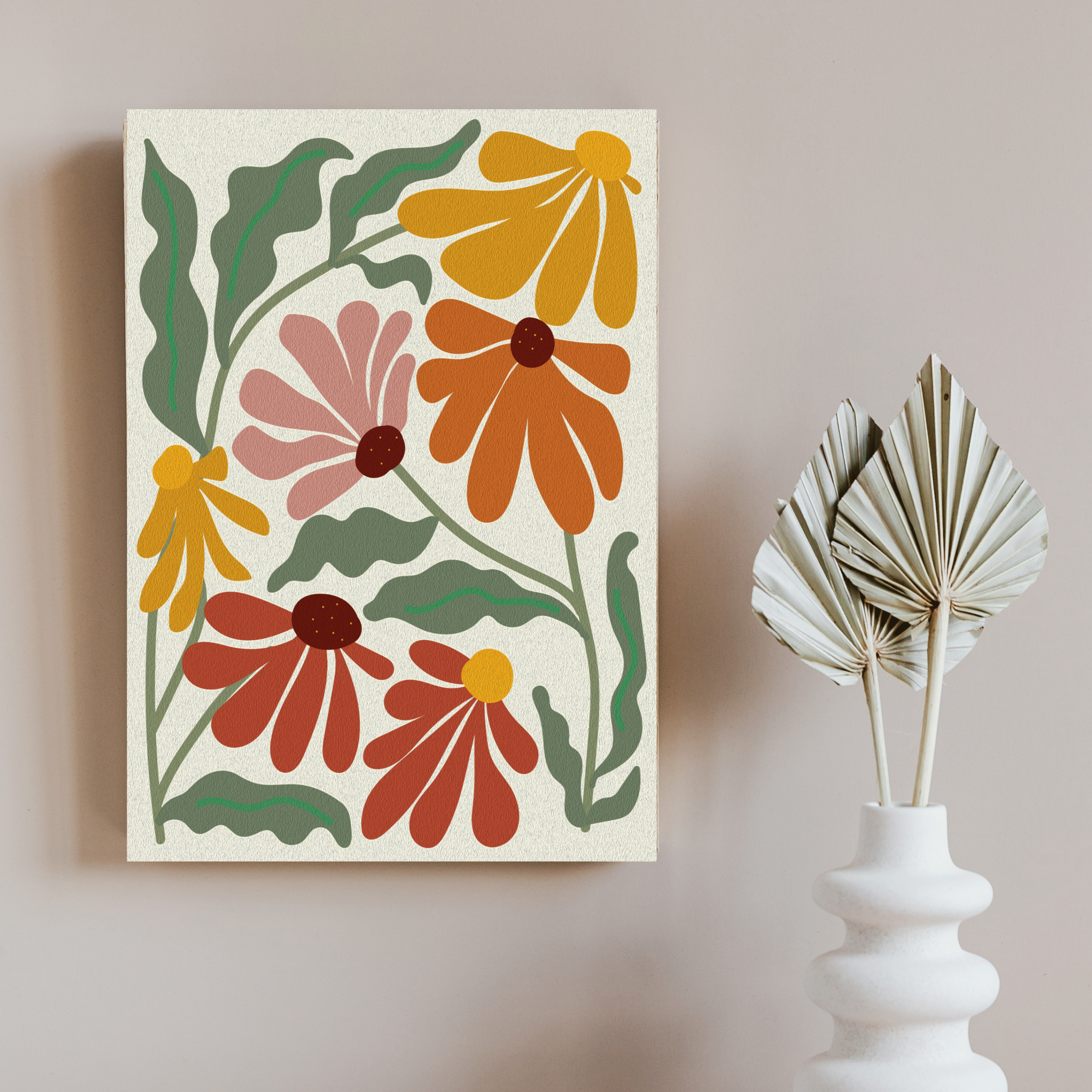 Des formes simples, des couleurs vives et une touche rétro : ce tableau évoque la chaleur et la beauté des journées ensoleillées. Idéal pour une décoration naturelle et pleine de vie.