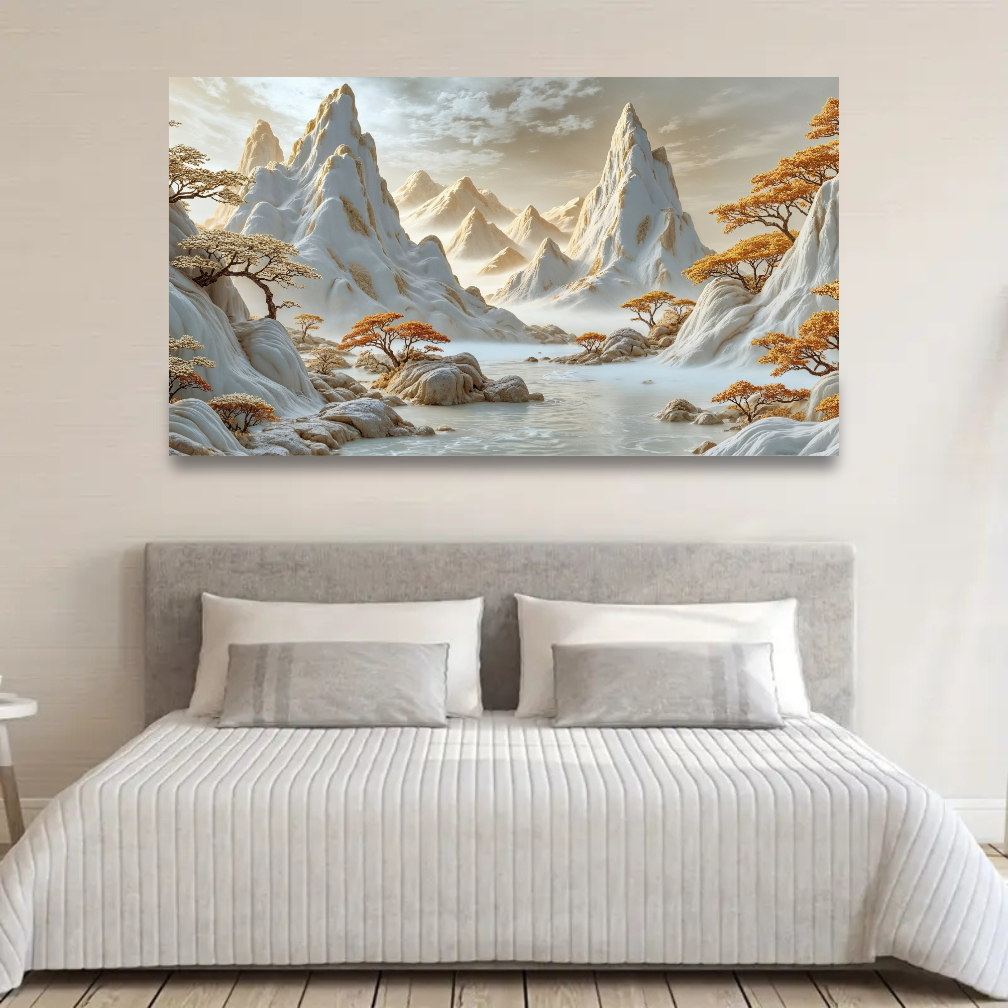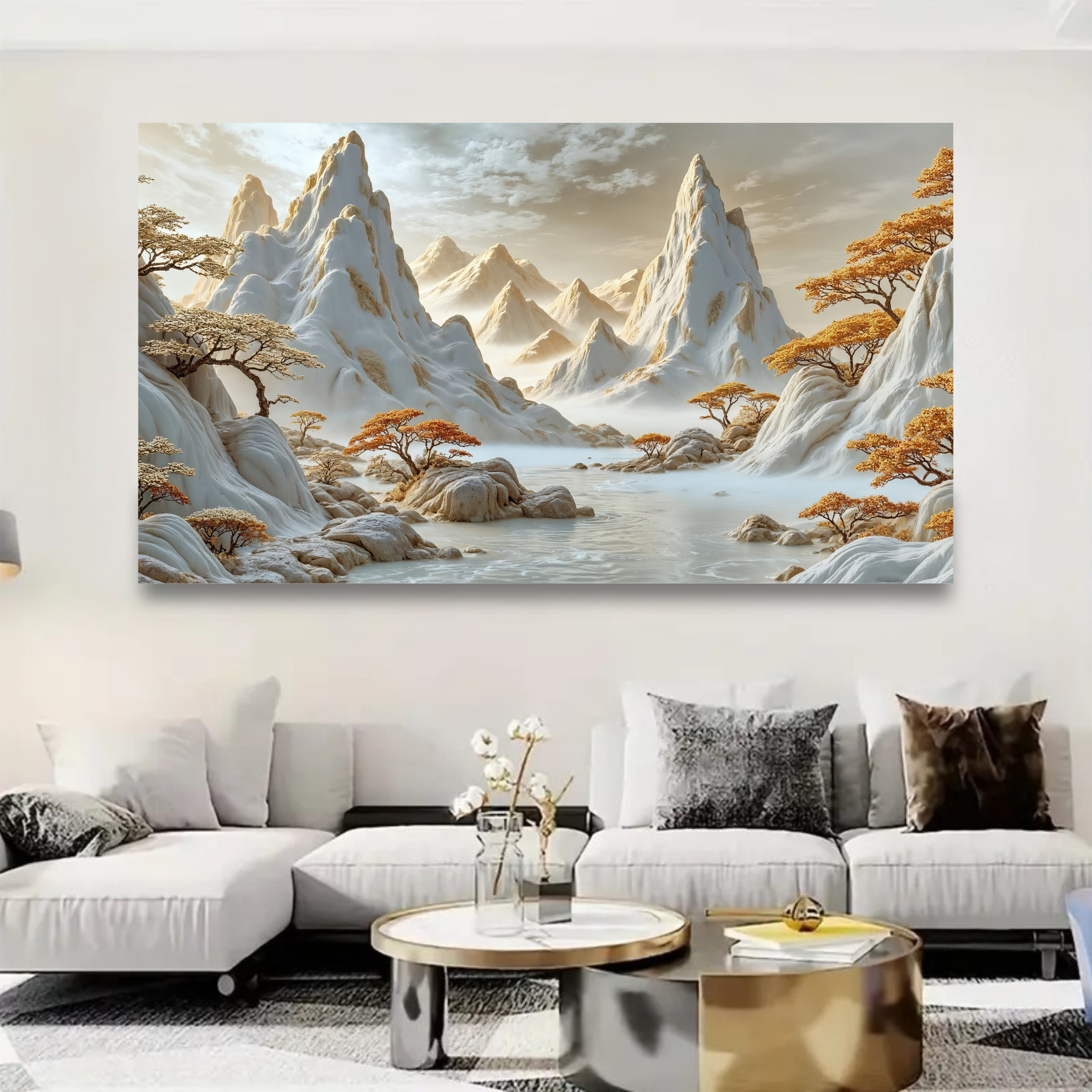 Apportez une douceur et une légèreté éthérées. Le contraste entre les montagnes d’un blanc pur et les touches d’ambre des arbres confère une élégance douce et lumineuse. Il est idéal pour adoucir un intérieur moderne et y ajouter une grâce poétique.